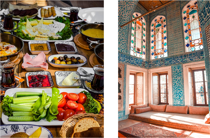 Start the day with breakfast like you’ve never seen it! Turks take big pride in their breakfast spread. On the savory side, you’ll find a variety of cheeses, olives, fresh tomatoes, cucumbers, sprigs of herbs, slices of garlicky sausage, boiled eggs, and maybe a juicy egg-tomato-pepper dish called menemen. In the sweet section, you’ll be acquainted with the locals’ love of jams, sticky grape molasses you can mix with tahini, thick yogurt, and the king of breakfast – kaymak (cream as thick as butter) drizzled with honey. Top it off with the daily staples of black tea (çay) and sesame bread rings (simit), and just take your time.