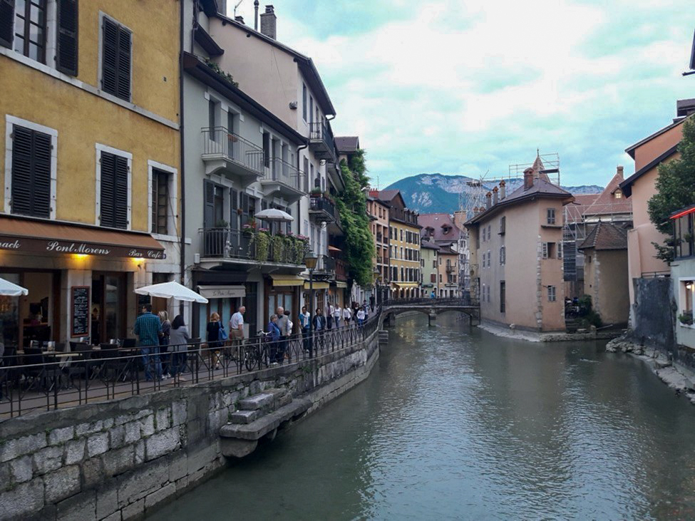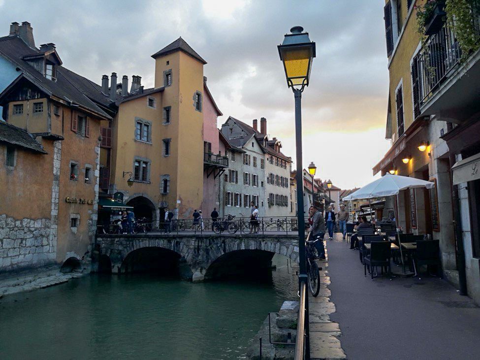 The sun is setting over Annecy – a good time to visit the orange building you see on the left – the old town pub.