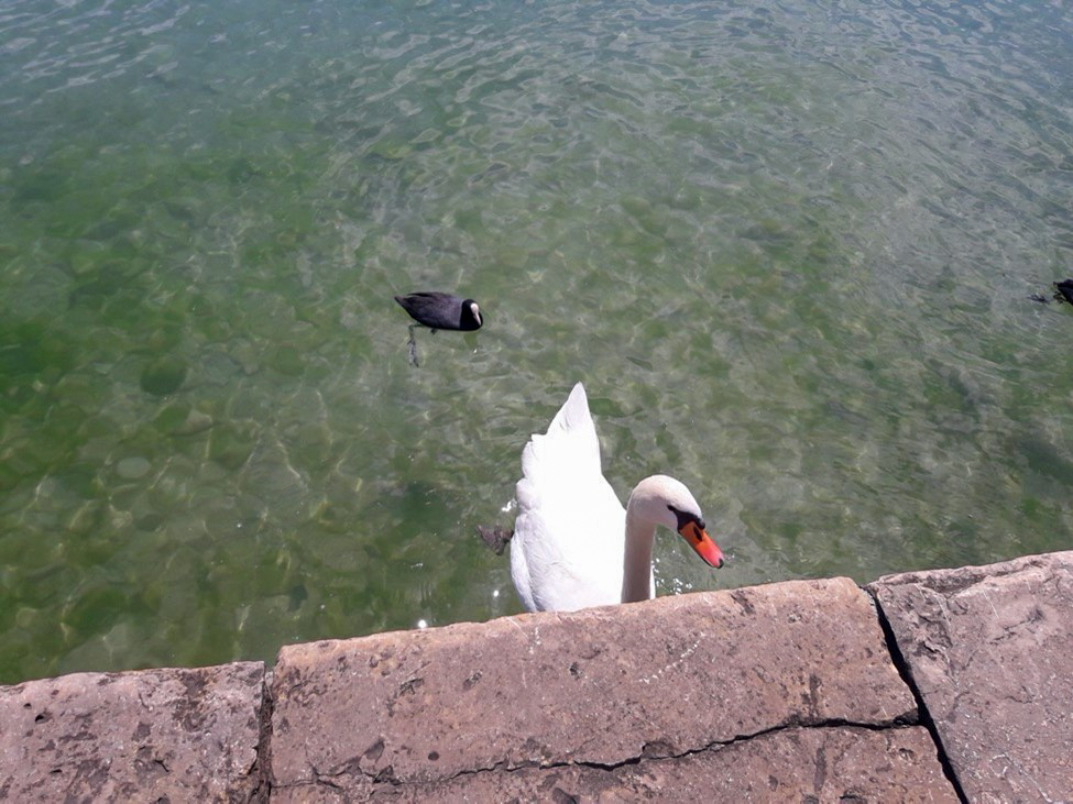 Visitors stop to watch the town’s resident ducks and swans, who just happened to have their tiny offspring in tow.