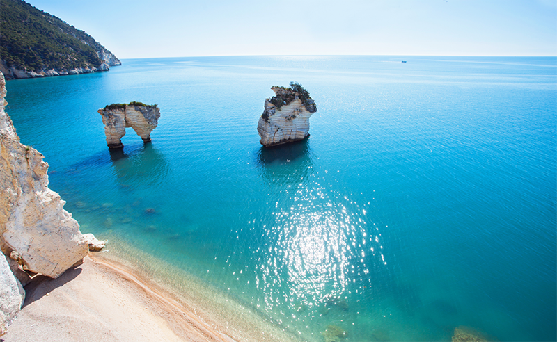 Puglia boasts some of Italy’s most stunning coastline, with spellbinding shades of blue and sandy or rocky coves. To the north of Bari is the Gargano Peninsula with Gargano National Park, where you can discover breathtaking beaches with white cliffs, sea arches, and transparent shallow waters, curving around from Mattinata to Peschici. Some of these beaches can be more of a challenge to reach, so good for a hiking adventure or a boat trip.