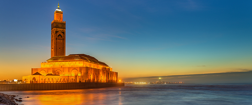 Heading inland you come to the Middle Atlas and then the High Atlas mountain ranges, covered with dense forest, wide valleys, isolated villages, hiking trails, and impressive peaks such as Mount Toubkal. Enter the fascinating world of the Berber people and see how they have learned to adapt and flourish on the land. One of the most remarkable examples is the town of Aït Benhaddou, cut into the hillside. Come also to stroll the old-world medina of FÈS, see the striking ornamental city gate of Bab el-Mansour in Meknes, visit the Roman ruins of Volubilis, and spend some time listening to the call of vendors in the old market square of Marrakesh. The ‘Red City’ of Marrakech is a popular place to make your base in Morocco – enjoy the bustling activity, wander lush courtyards, and watch the evening street performers at Djemaa el-Fna.